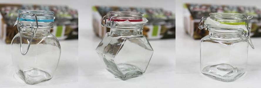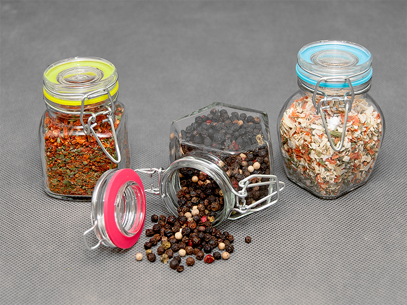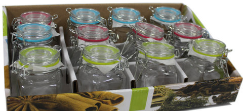 Zestaw 12 hermetycznch szklanych słoiczkow na przyprawy o pojemności 90 ml. Każdy pojemnik posiada szklaną pokrywkę z silikonową uszczelką, co zwiększa jego szczelność. /IDE6730/